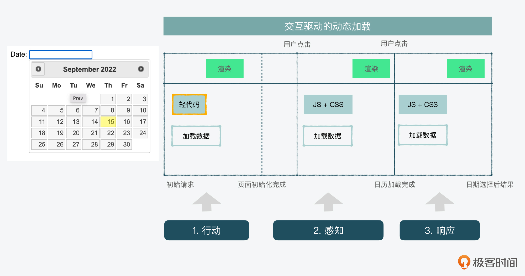 那么,当用户点击了一个按钮,比如一个日历的时候,我们就进行到了第二步,即感知到用户想要选择一个日期。所以,我们就可以给这个按钮加上事件处理器(event handler),完成相关的日历组件或模块加载,通过之前“记住”的用户需求,展示加载后的日历,这也就是第三步,响应。