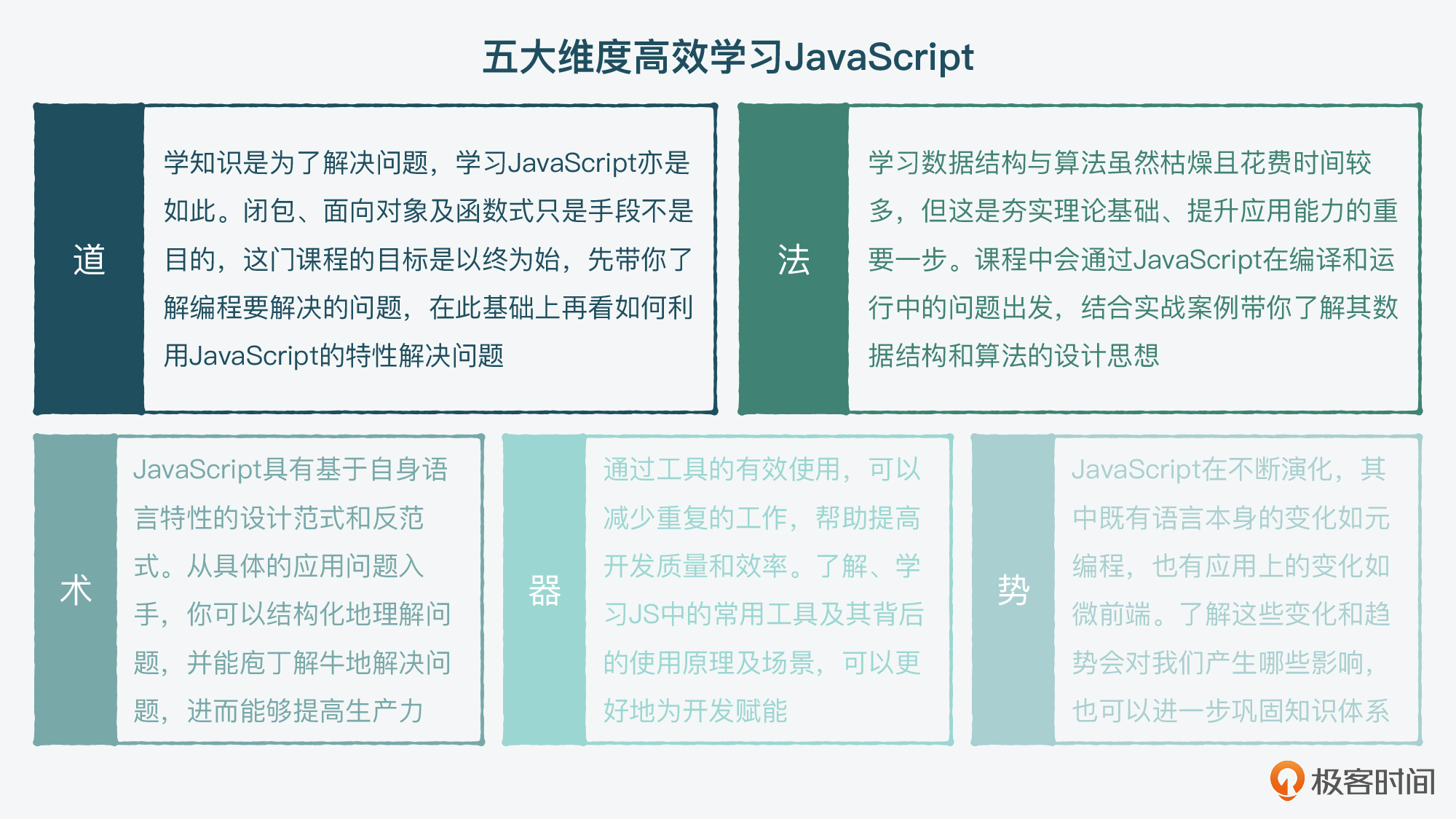 所以这门课的初衷,就是让学习JavaScript的你,能够对这个开始比较不那么“专业”的语言,有一个系统的专业理解。帮助你一步一个脚印,把点连成线,把线连成面,把面搭建起一座空间立体的“思维大厦”。