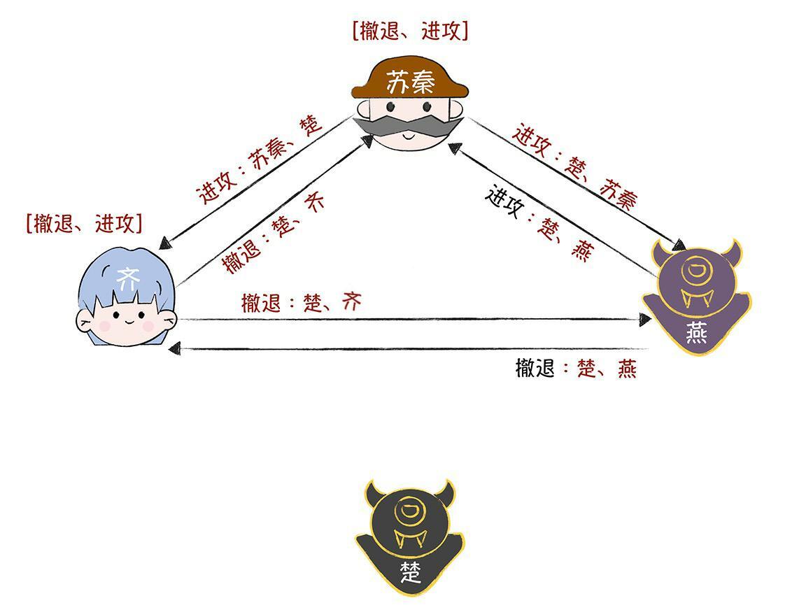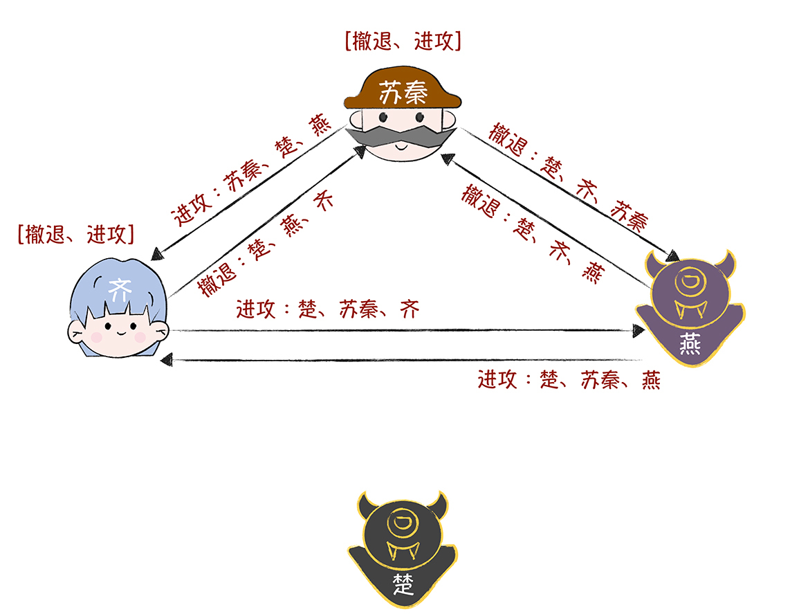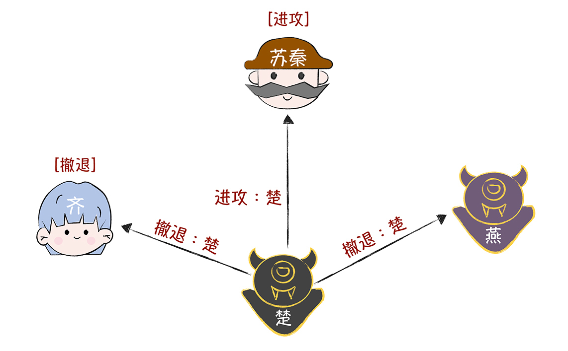 最终,齐收到的作战信息都是“进攻”(它收到了苏秦和楚的),按照“执行盒子最中间的指令”的约定,齐会和苏秦一起执行作战指令“进攻”,实现忠将们作战计划的一致性。