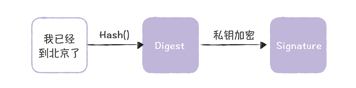 然后,Bob用哈希算法(比如MD5)对消息进行摘要,然后用私钥对摘要进行加密,生成数字签名(Signature),就像下图的样子: