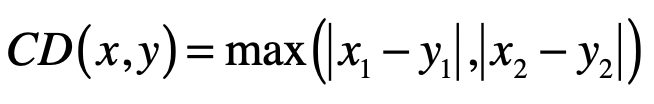 切比雪夫其实是在模拟国际象棋里国王的走法。国王可以走临近8个格子里的任何一个,那么国王从格子$(x_{1},x_{2})$走到格子$(y_{1},y_{2})$最少需要多少步呢?其实就是二维空间里的切比雪夫距离。