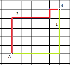 从图中可以看出,从A点到B点有多条路径,但是无论哪条,曼哈顿距离都是一样的。