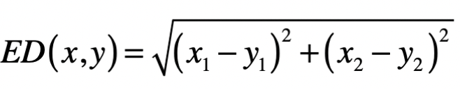 欧氏距离,其实就是欧几里得距离。欧氏距离是一个常用的距离定义,指在n维空间中两个点之间的真实距离,在二维空间中,两个点$x(x_{1},x_{2})$与$y(y_{1},y_{2})$间的欧氏距离是:
