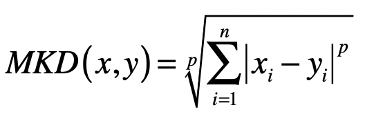 两个$n$维变量$x(x_{1},x_{2},…,x_{n})$与$y(y_{1},y_{2},…,y_{n})$间的闵氏距离的定义为: