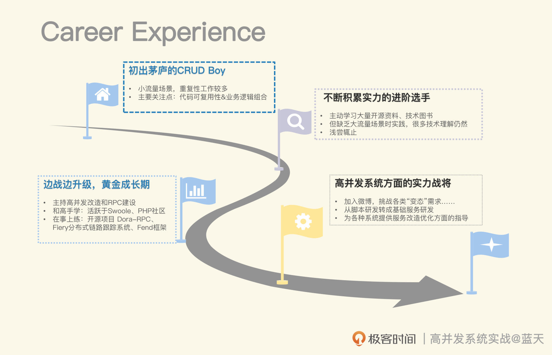 我目前在极客时间担任架构师一职,在此之前从事架构已有十几年,曾就职于穷游网、微博、好未来,主要做老系统的高并发迁移与改造,对RPC建设、服务化、框架、分布式链路跟踪监控以及Kubernetes管理平台拥有丰富的经验。