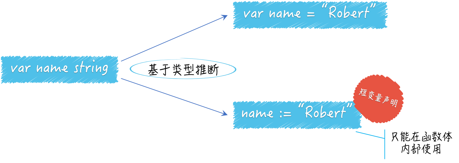 至于第二种方式所用的短变量声明,实际上就是Go语言的类型推断再加上一点点语法糖。