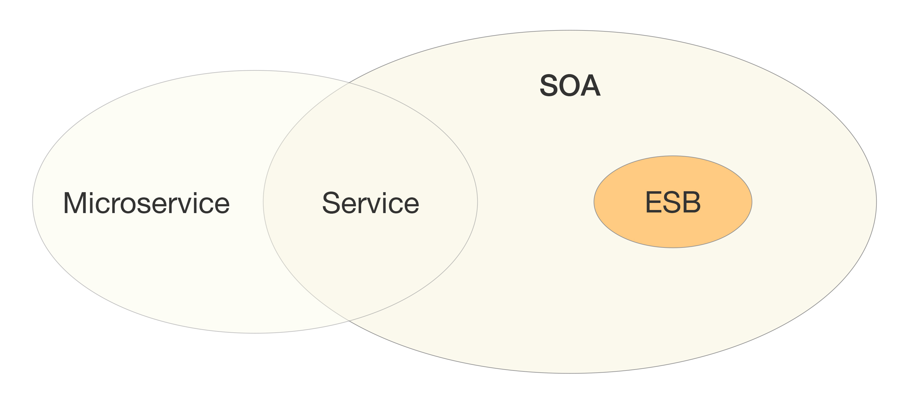 如下图所示,这种观点认为微服务和SOA只是有点类似,但本质上是不同的架构设计理念。相似点在于下图中交叉的地方,就是两者都关注“服务”,都是通过服务的拆分来解决可扩展性问题。本质上不同的地方在于几个核心理念的差异:是否有ESB、服务的粒度、架构设计的目标等。