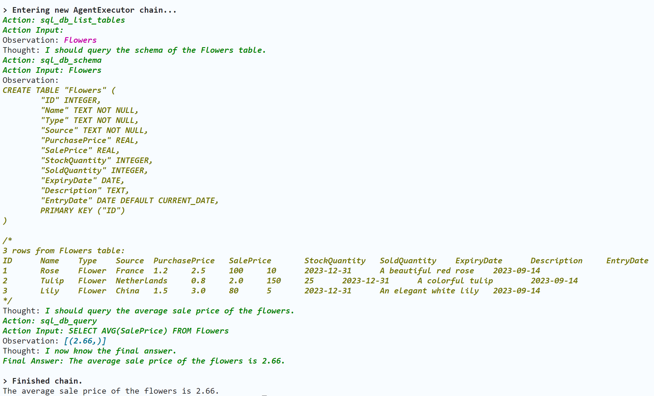 这里,我们导入必要的LangChain模块,然后连接到FlowerShop数据库,初始化OpenAI的LLM实例。之后用SQLDatabaseChain来创建一个从LLM到数据库的链接。
