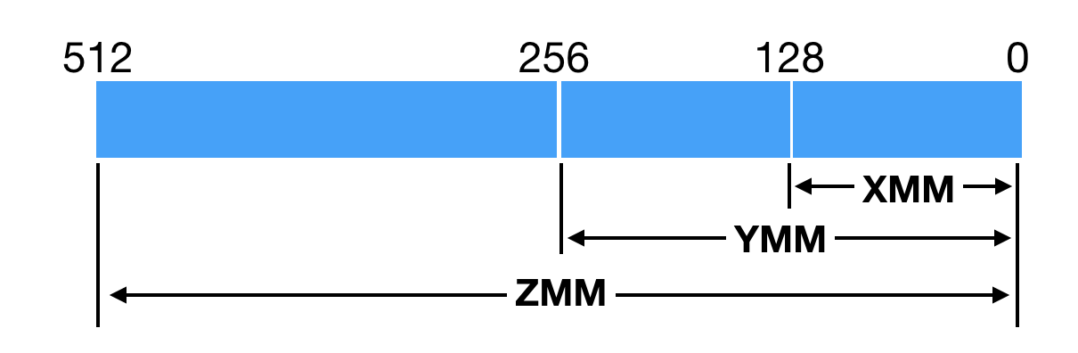 所谓的XMM寄存器,是由SSE(Streaming SIMD Extensions)指令集所引入的。它们一开始仅为128位。自从X86平台上的CPU开始支持AVX(Advanced Vector Extensions)指令集后(2011年),XMM寄存器便升级为256位,并更名为YMM寄存器。原本使用XMM寄存器的指令,现将使用YMM寄存器的低128位。