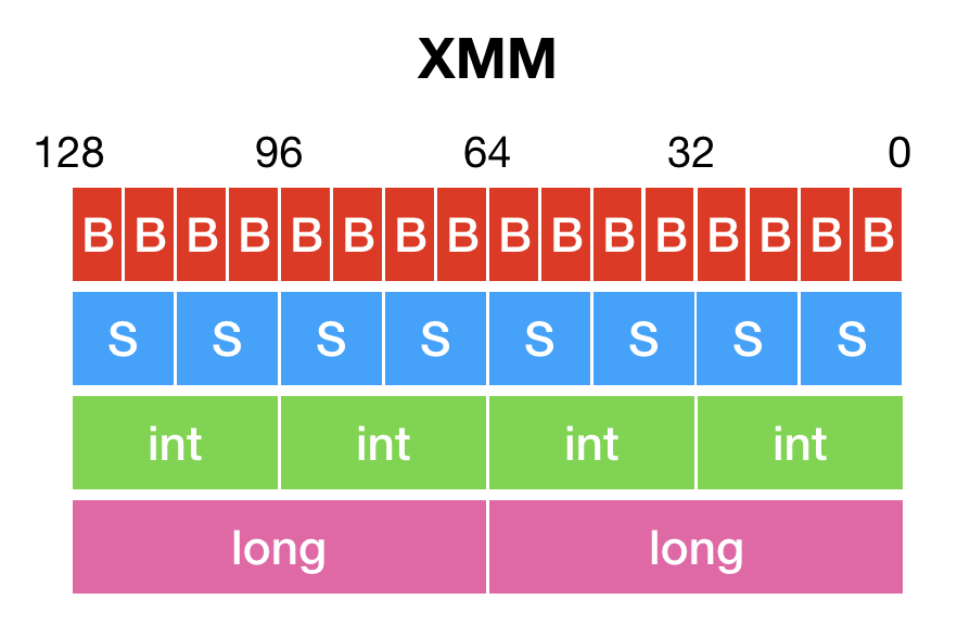举例来说,128位XMM寄存器里的值可以看成16个byte值组成的向量,或者8个short值组成的向量,4个int值组成的向量,两个long值组成的向量;而SIMD指令PADDB、PADDW、PADDD以及PADDQ,将分别实现byte值、short值、int值或者long值的向量加法。