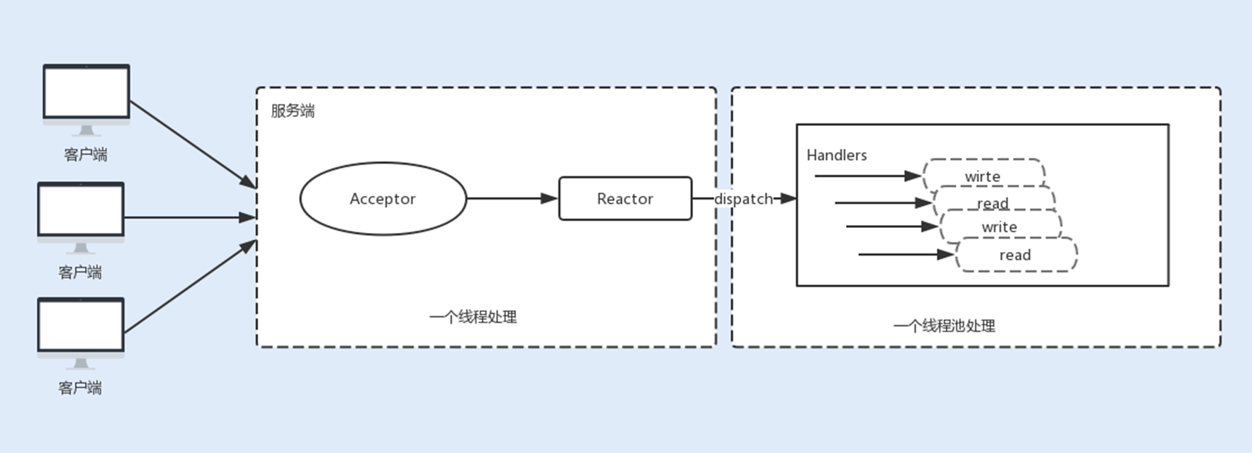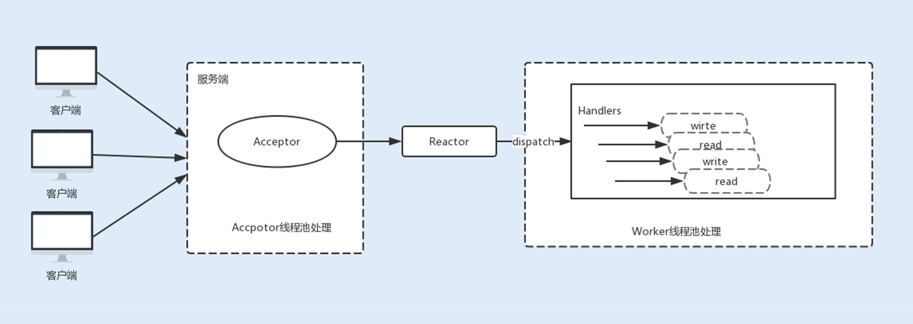 - 事件处理器Handlers:事件处理器主要是完成相关的事件处理,比如读写I/O操作。