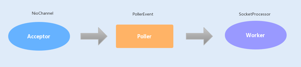 **在NIO中,**Tomcat新增了一个Poller线程池,Acceptor监听到连接后,不是直接使用Worker中的线程处理请求,而是先将请求发送给了Poller缓冲队列。在Poller中,维护了一个Selector对象,当Poller从队列中取出连接后,注册到该Selector中;然后通过遍历Selector,找出其中就绪的I/O操作,并使用Worker中的线程处理相应的请求。
