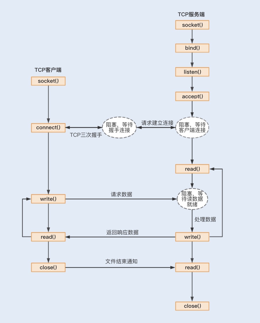 在整个socket通信工作流程中,socket的默认状态是阻塞的。也就是说,当发出一个不能立即完成的套接字调用时,其进程将被阻塞,被系统挂起,进入睡眠状态,一直等待相应的操作响应。从上图中,我们可以发现,可能存在的阻塞主要包括以下三种。