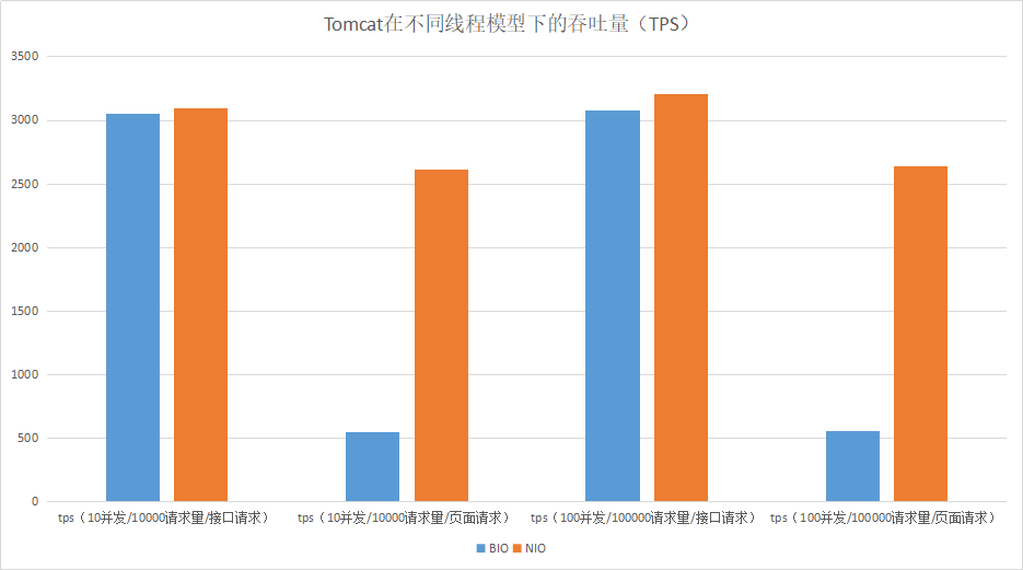 我们可以通过一个性能对比测试来看看在高负载或高并发的情况下,BIO和NIO通信性能(这里用页面请求模拟多I/O读写操作的请求):