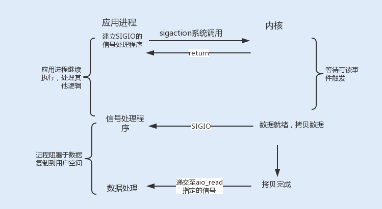 信号驱动式I/O类似观察者模式,内核就是一个观察者,信号回调则是通知。用户进程发起一个I/O请求操作,会通过系统调用sigaction函数,给对应的套接字注册一个信号回调,此时不阻塞用户进程,进程会继续工作。当内核数据就绪时,内核就为该进程生成一个SIGIO信号,通过信号回调通知进程进行相关I/O操作。