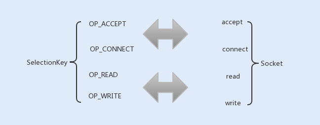 我们在上面的TCP通信流程中讲到,Socket通信中的conect、accept、read以及write为阻塞操作,在Selector中分别对应SelectionKey的四个监听事件OP_ACCEPT、OP_CONNECT、OP_READ以及OP_WRITE。