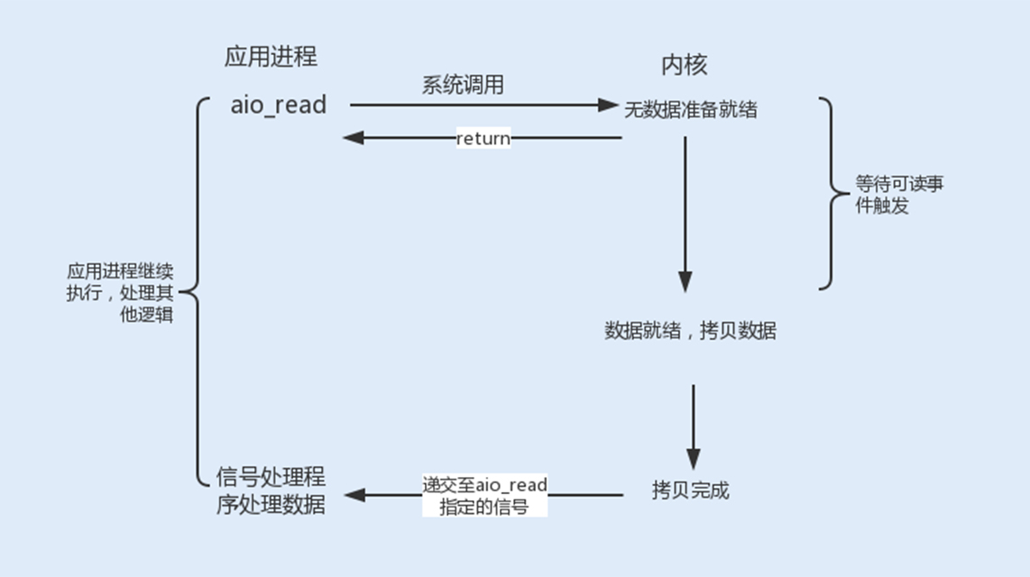信号驱动式I/O虽然在等待数据就绪时,没有阻塞进程,但在被通知后进行的I/O操作还是阻塞的,进程会等待数据从内核空间复制到用户空间中。而异步I/O则是实现了真正的非阻塞I/O。