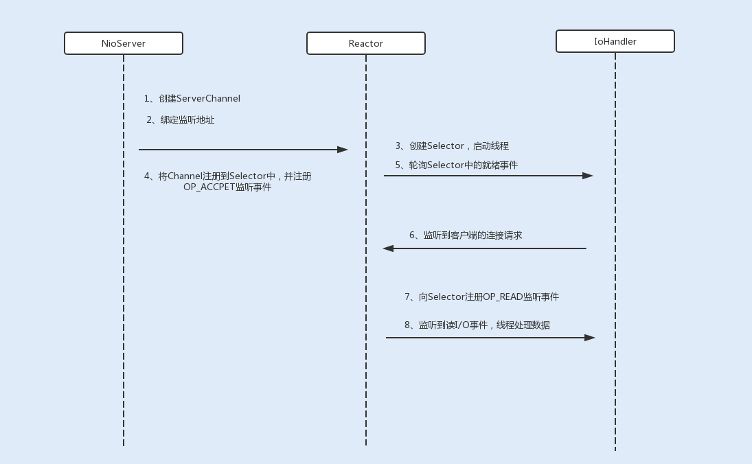 - 事件分离器Reactor:接收请求后,会将建立的连接注册到分离器中,依赖于循环监听多路复用器Selector,一旦监听到事件,就会将事件dispatch到事件处理器;