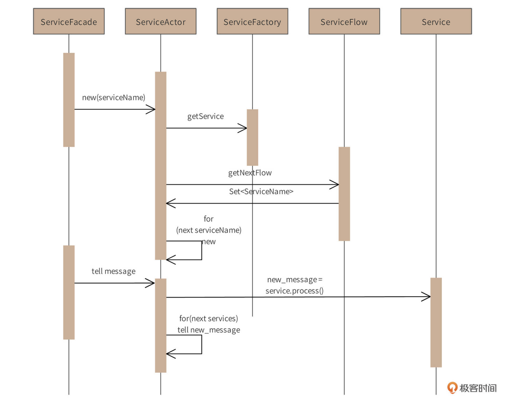 时序图中的第二个过程是消息流处理过程。调用者发送给ServiceFacade的消息,会被flow流程中的第一个ServiceActor处理,这个ServiceActor会调用对应的Service实例,并将Service实例的返回值作为消息发送给流程定义的后续ServiceActor。