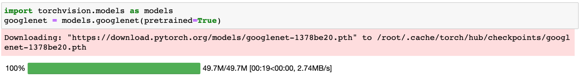 这时候的 GoogLeNet 模型,相当于只有一个实例化好的网络结构,里面的参数都是随机初始化的,需要经过训练之后才能使用,并不能直接用于预测。torchvision.models模块除了包含了定义好的网络结构,还为我们提供了预训练好的模型,我们可以直接导入训练好的模型来使用。导入预训练好的模型的代码如下: