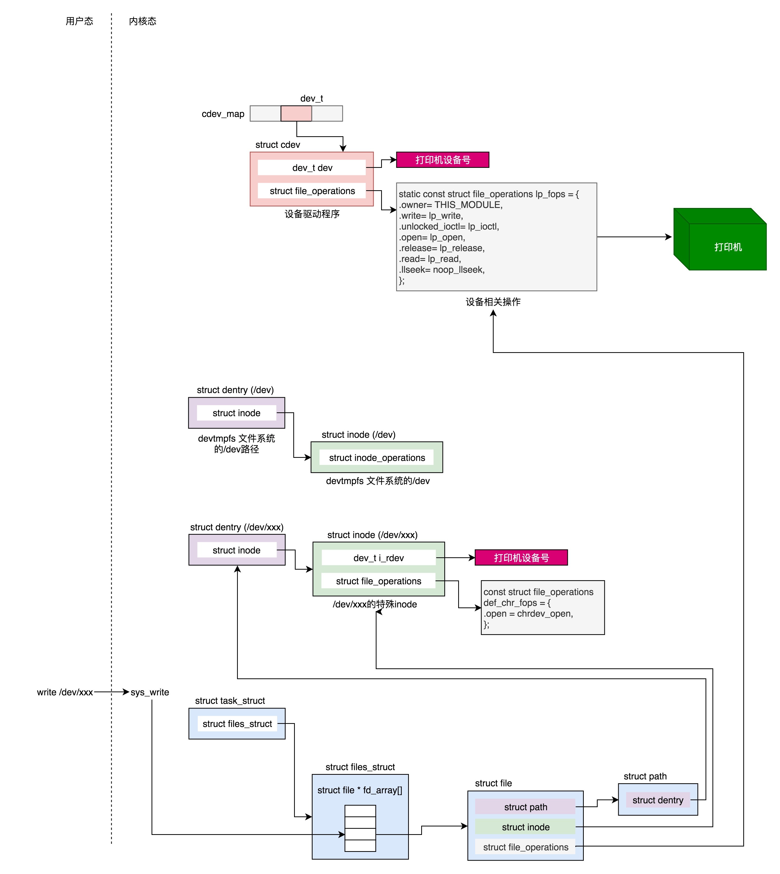 写入字符设备 当我们像打开一个文件一样打开一个字符设备之后,接下来就是对这个设备的读写。对于文件的读写咱们在文件系统那一章详细讲述过,读写的过程是类似的,所以这里我们只解析打印机驱动写入的过程。
