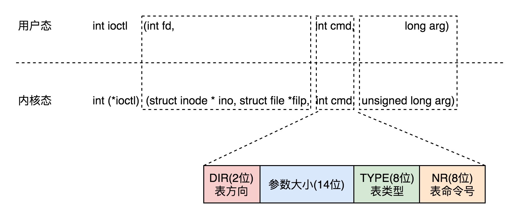 其中,fd是这个设备的文件描述符,cmd是传给这个设备的命令,arg是命令的参数。其中,对于命令和命令的参数,使用ioctl系统调用的用户和驱动程序的开发人员约定好行为即可。
