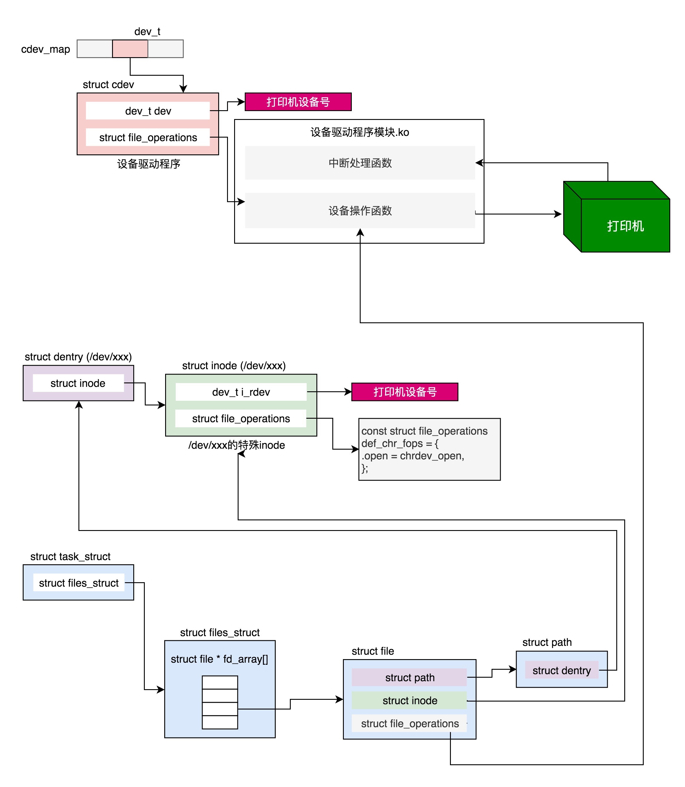 1 2 3 4 5 6 7 8 9 10 11 12 13 14 15 16 17 18 19 20 21 22 23 24 25 26 27 28 29 static int __init lp_init (void) { ...... if (register_chrdev (LP_MAJOR, "lp", &lp_fops)) { printk (KERN_ERR "lp: unable to get major %d\n", LP_MAJOR); return -EIO; } ...... } int __register_chrdev(unsigned int major, unsigned int baseminor, unsigned int count, const char *name, const struct file_operations *fops) { struct char_device_struct *cd; struct cdev *cdev; int err = -ENOMEM; ...... cd = __register_chrdev_region(major, baseminor, count, name); cdev = cdev_alloc(); cdev->owner = fops->owner; cdev->ops = fops; kobject_set_name(&cdev->kobj, "%s", name); err = cdev_add(cdev, MKDEV(cd->major, baseminor), count); cd->cdev = cdev; return major ? 0 : cd->major; }
