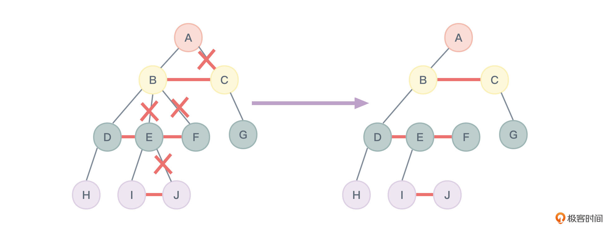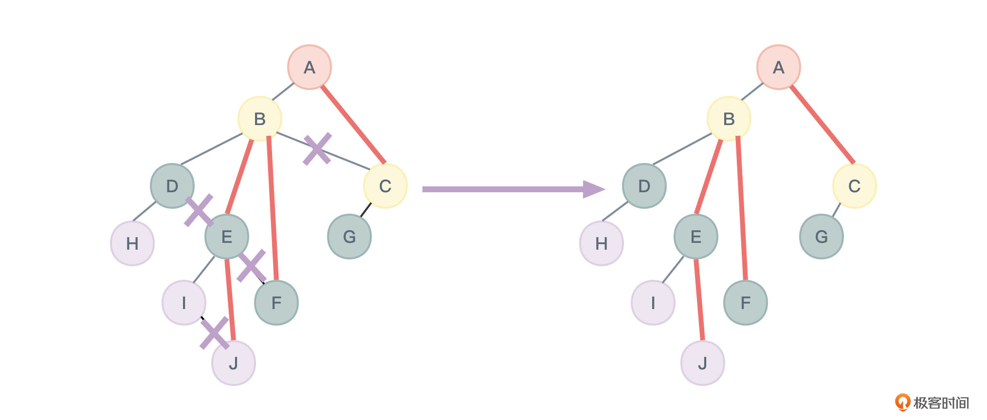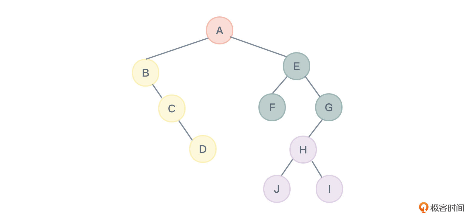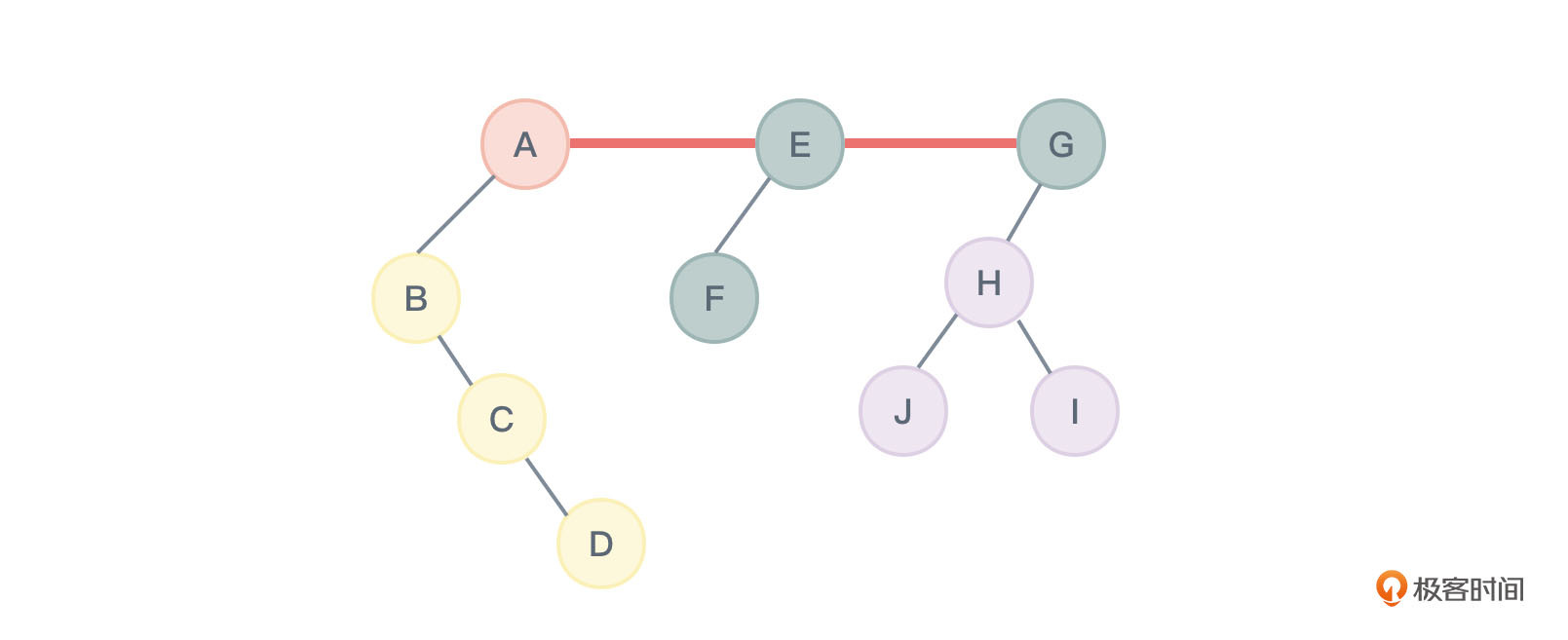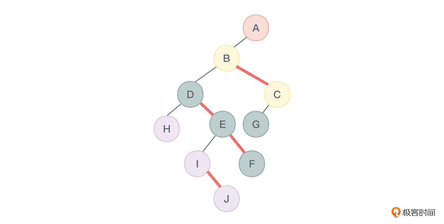 - 加线:若某个节点X是其父节点Y的左孩子,则把X的右孩子,右孩子的右孩子……,都与Y用连线连接起来。A和C相连,B和E相连,B和F相连,E和J相连。如图24所示:
