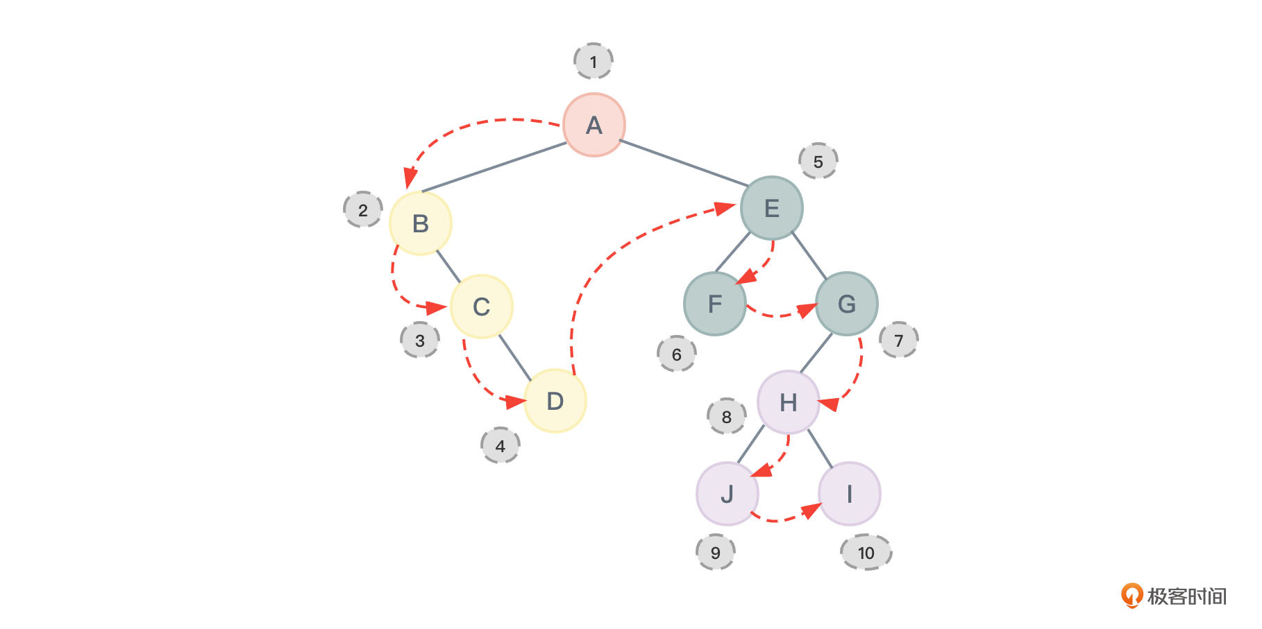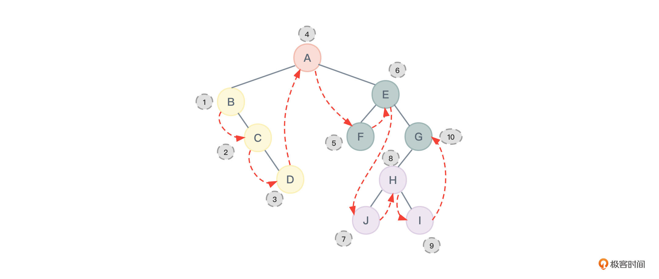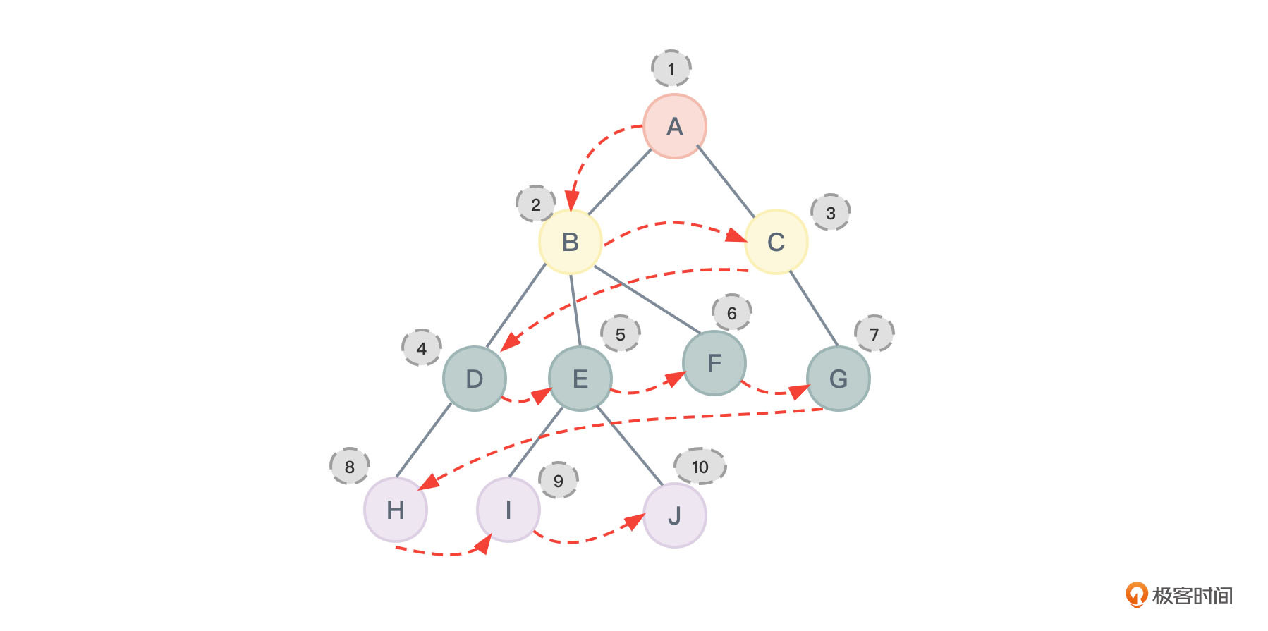 对图2进行层序遍历所得到的结果应该为:ABCDEFGHIJ,节点的访问顺序如图31所示: