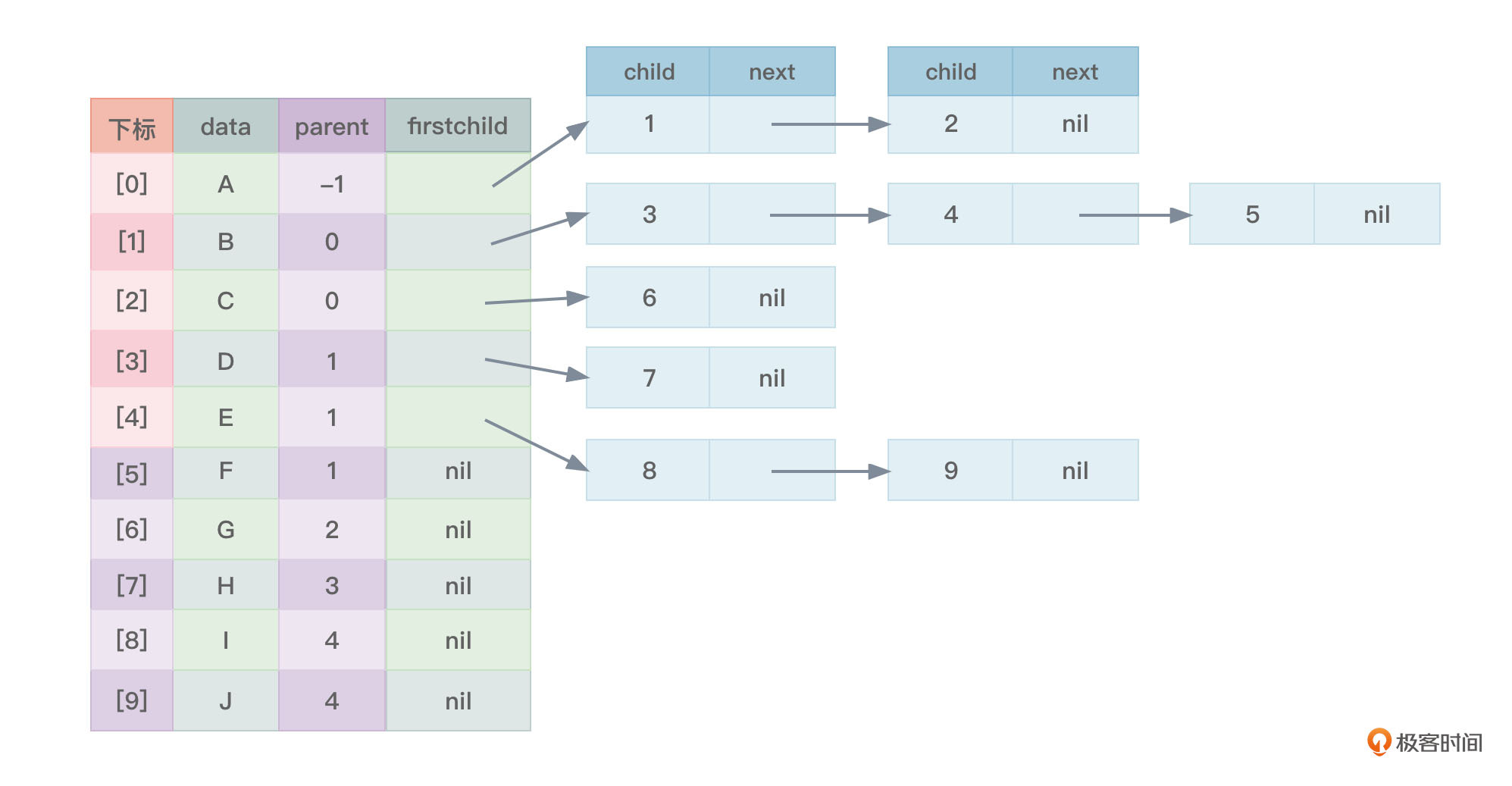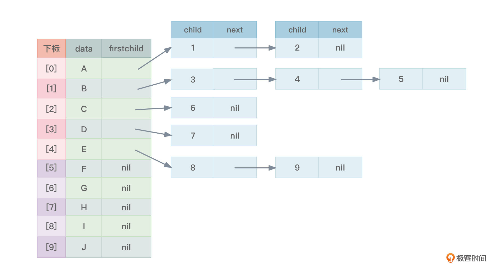 这种存储方式虽然比较直观,但是当树中各个节点的度差异较大时,是很浪费存储空间的,图7中不难看到,很多指针域都是空的(nil标记)。当然,如果树中各个节点的度差异很小时,这种存储方式就显得非常不错。