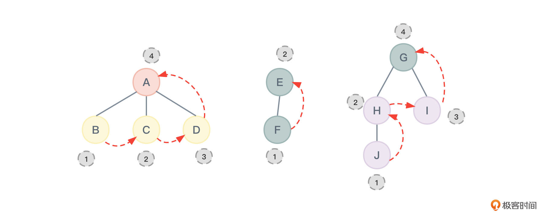 对图2进行后序遍历所得到的结果应该为:HDIJEFBGCA,节点的访问顺序如图30所示: