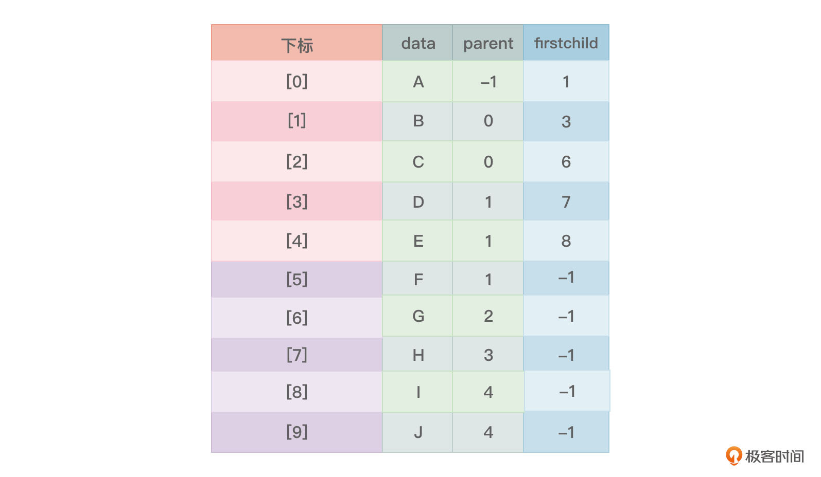 图3中,寻找一个节点的父节点相当容易,因为就在其parent中记录着。但寻找一个节点的孩子节点,就比较繁琐,只能到数组中去找,看谁的parent值是该节点在数组中的下标值,谁就是该节点的孩子。可以向节点结构TreeNode中增加一个称为firstchild的新成员以记录该节点的第一个孩子在数组中的下标,那么图3的内容就可以进一步丰富,如图4所示: