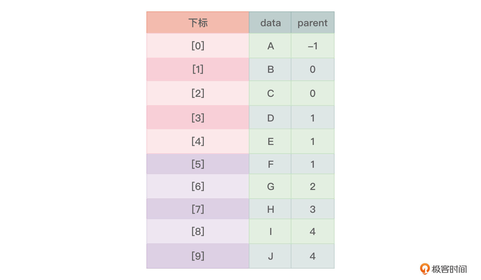 双亲表示法保存树所采用的结构类似于静态链表,即用一维数组(一组连续的空间)来存储树的各个节点,数组中的一个元素对应树中的一个节点。节点是一个结构,其中不但包含了节点所包含的数据(数据域,data),还包含了该节点的父节点在数组中的下标(指针域,parent)。