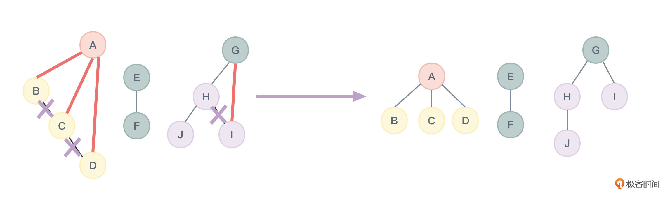 接下来涉及的话题是详细地阐述如何将树转换为二叉树。因为树的形状千奇百怪,不好寻找规律,而操作二叉树就容易得多。将树转换为二叉树只需要通过加线、去线、调整方向即可做到。