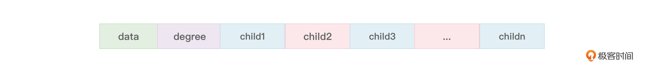图8中,data是数据域,degree称为度域,存放该节点的度,也就是该节点的孩子节点个数。child0~childn是指针域,用来指向该节点的孩子节点。