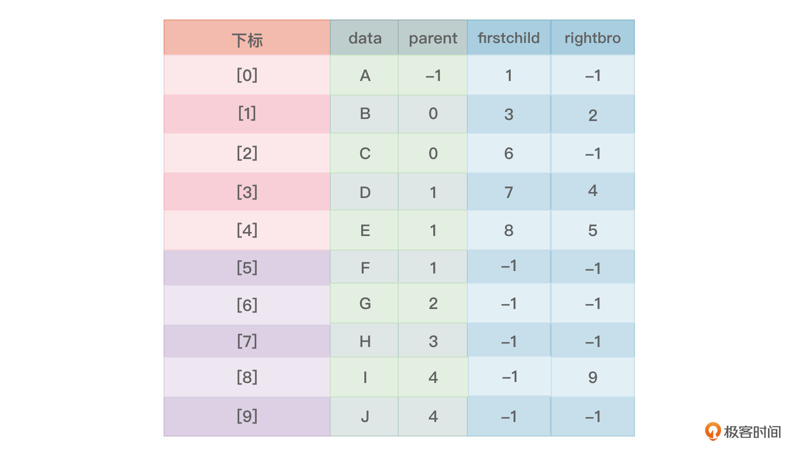 通过图5来查找一个节点的所有孩子节点就比较方便,比如要查找节点B的孩子节点,可以找到节点B的firstchild列,为3,在找到下标3的rightbro列,为4,再找到下标4的rightbro列,为5,再找下标5的rightbro列,发现为-1,则寻找结束,所以,节点B的孩子从左到右为下标3对应的节点D,下标4对应的节点E以及下标5对应的节点F。