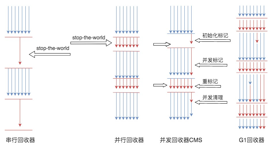 在串行和并行垃圾回收过程中,当垃圾回收线程工作的时候,必须要停止用户线程的工作,否则可能会导致对象的引用标记错乱,因此垃圾回收过程也被称为stop the world,在用户视角看来,所有的程序都不再执行,整个世界都停止了。