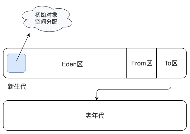 新生代又分为Eden区、From区和To区三个区域,每次垃圾回收都是扫描Eden区和From区,将存活对象复制到To区,然后交换From区和To区的名称引用,下次垃圾回收的时候继续将存活对象从From区复制到To区。当一个对象经过几次新生代垃圾回收,也就是几次从From区复制到To区以后,依然存活,那么这个对象就会被复制到老年代区域。