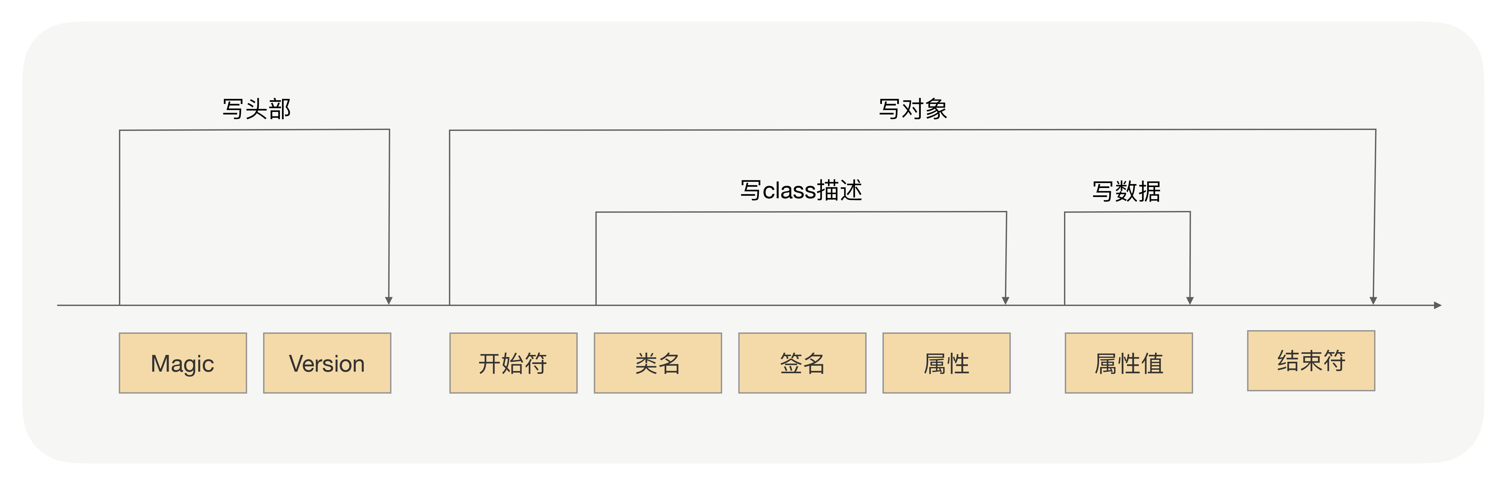 实际上任何一种序列化框架,核心思想就是设计一种序列化协议,将对象的类型、属性类型、属性值一一按照固定的格式写到二进制字节流中来完成序列化,再按照固定的格式一一读出对象的类型、属性类型、属性值,通过这些信息重新创建出一个新的对象,来完成反序列化。