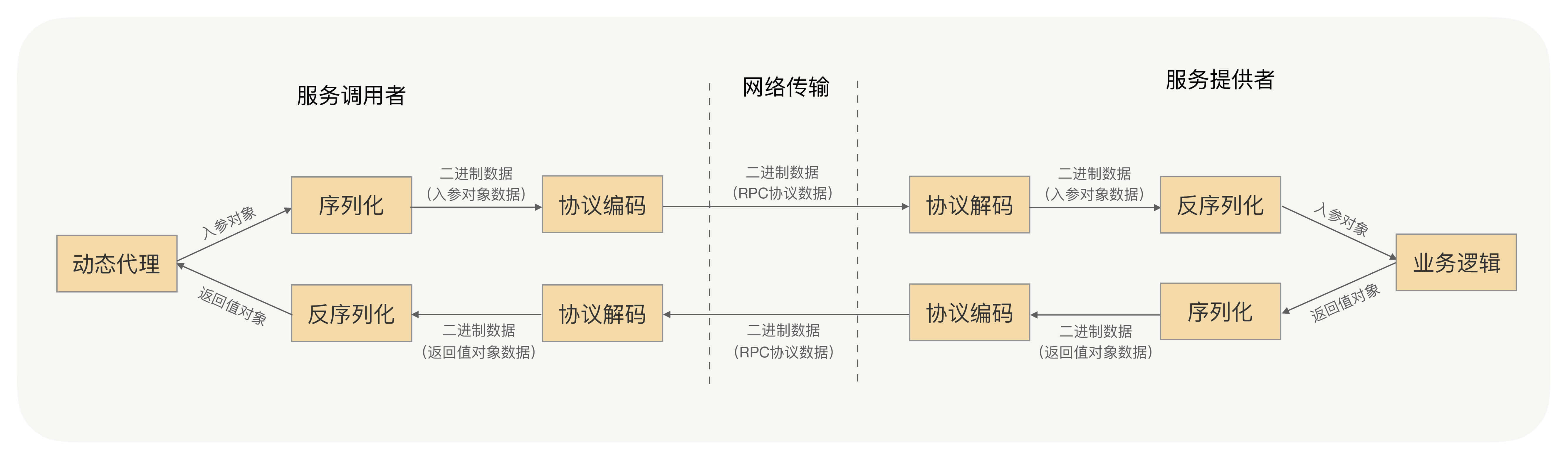 网络传输的数据必须是二进制数据,但调用方请求的出入参数都是对象。对象是不能直接在网络中传输的,所以我们需要提前把它转成可传输的二进制,并且要求转换算法是可逆的,这个过程我们一般叫做“序列化”。 这时,服务提供方就可以正确地从二进制数据中分割出不同的请求,同时根据请求类型和序列化类型,把二进制的消息体逆向还原成请求对象,这个过程我们称之为“反序列化”。