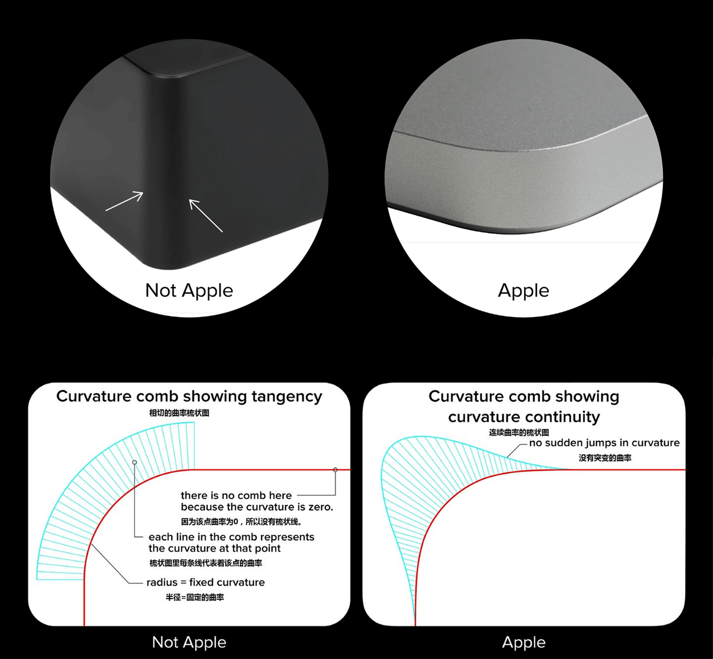 苹果的圆角采用的是不同曲率的10段曲线相连,这些曲线全部为 3 阶贝塞尔曲线,导致前后相连肉眼可辨别的曲率连续,这样也就产生了非常流畅的直线到曲线的过度。这种刻意复杂度的增加就是在提升视觉的愉悦度,所以苹果的圆角看起来会更美。