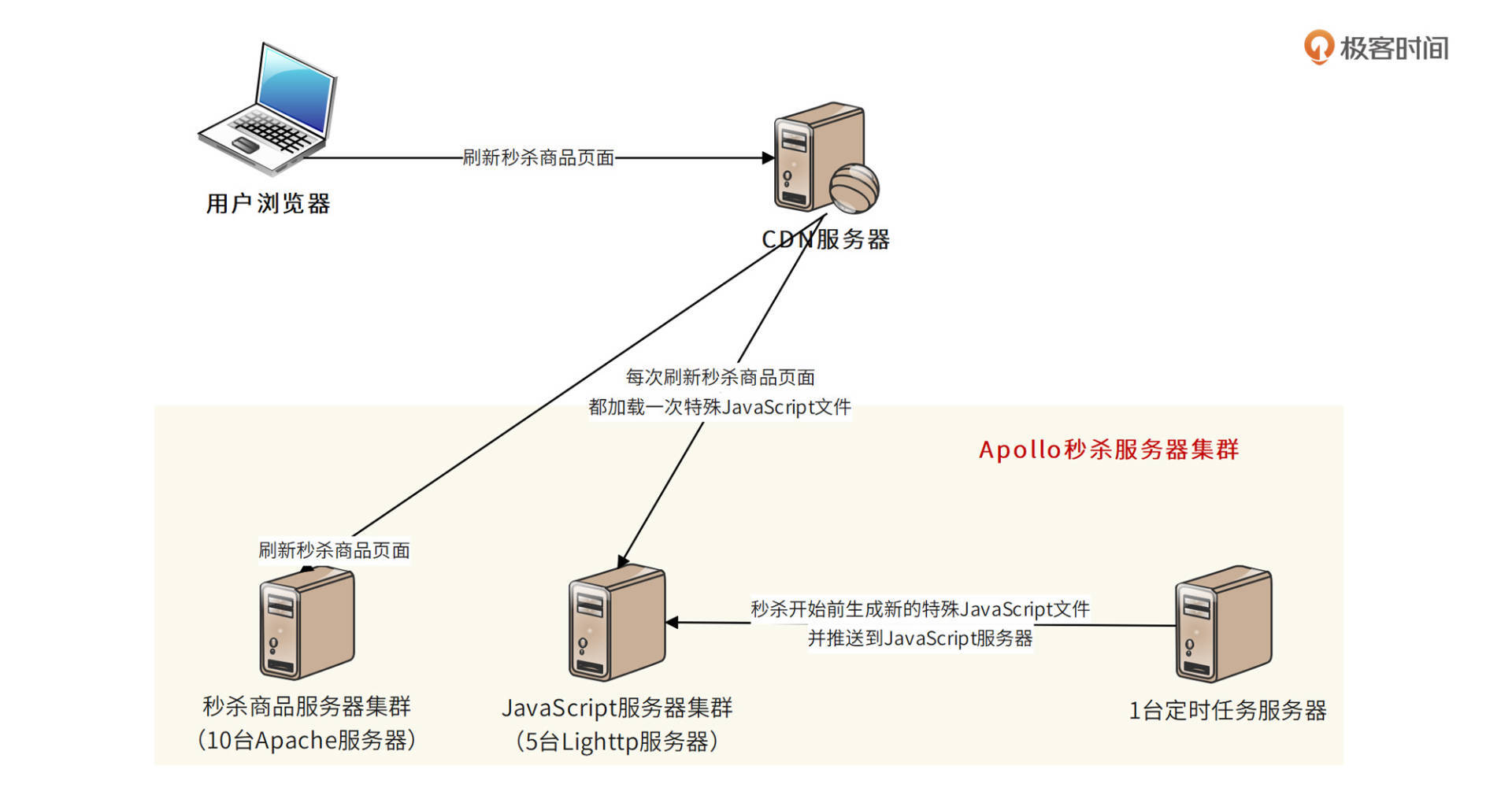 为了应对这种比较特殊的营销活动,我们启动了一个专门的秒杀项目,项目代号是“Apollo”。Apollo的核心挑战是:如何应对突然出现的数百倍高并发访问压力,并保证用户只有在秒杀开始时才能下单购买秒杀商品?接下来我们就看看Apollo的需求与技术架构吧。