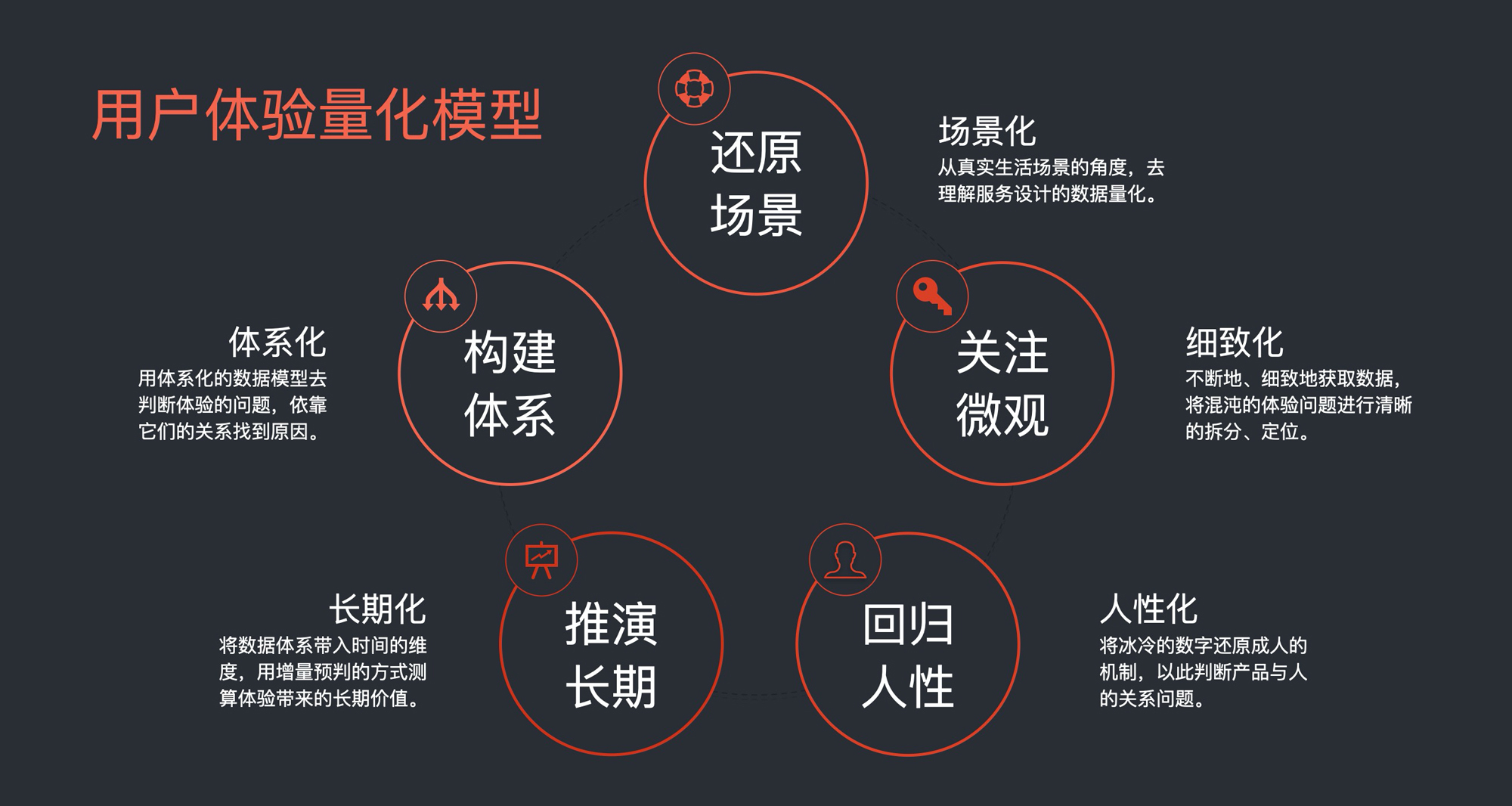 但真实的用户体验当中,掺杂了太多人的因素和细节,产生了太多的不确定性,它不像商业交易数据那么明确,所以我们在面对不同的商业体时,要学会设计不同的用户体验量化维度。那么接下来,我们就一起站在构建体系、还原场景、关注微观、回归人性、推演长期五个维度,来还原主观体验的量化办法。