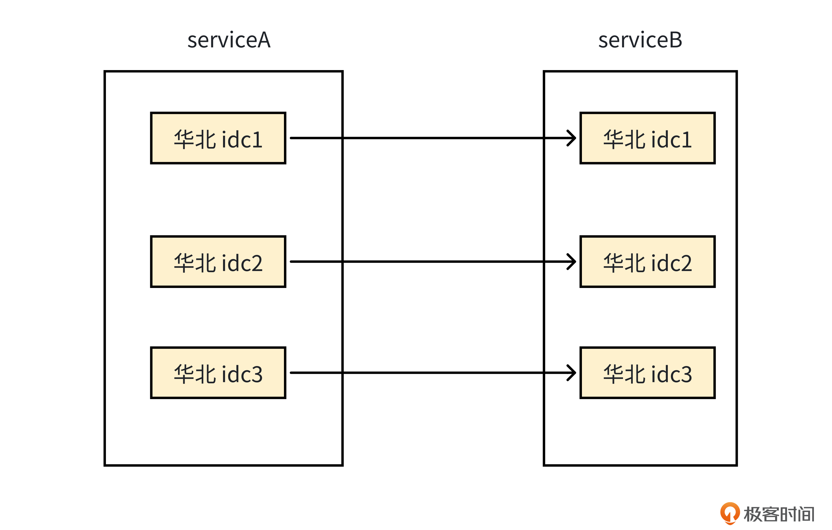 第一个策略是,当两个服务在多地域有部署时,Client和Server不进行跨地域调用。比如,以下面的图为例,服务A在华北区域的服务器,只调用服务B在华北区域部署的服务器,尽量不要跨地域去调用服务B在华东区域部署的服务器。