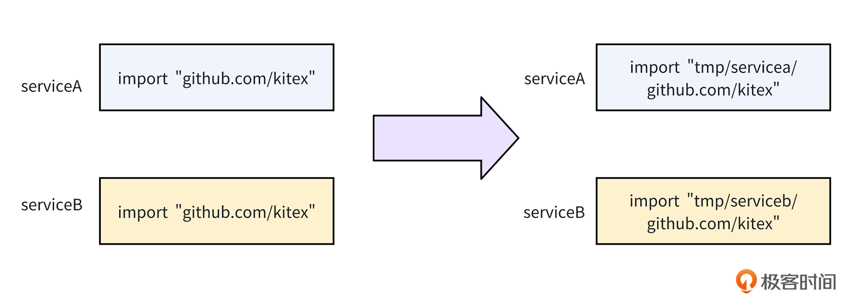 接着,就像下面的图展示的一样,我们需要给两个服务代码里的import path,加个不同的前缀方便区分。