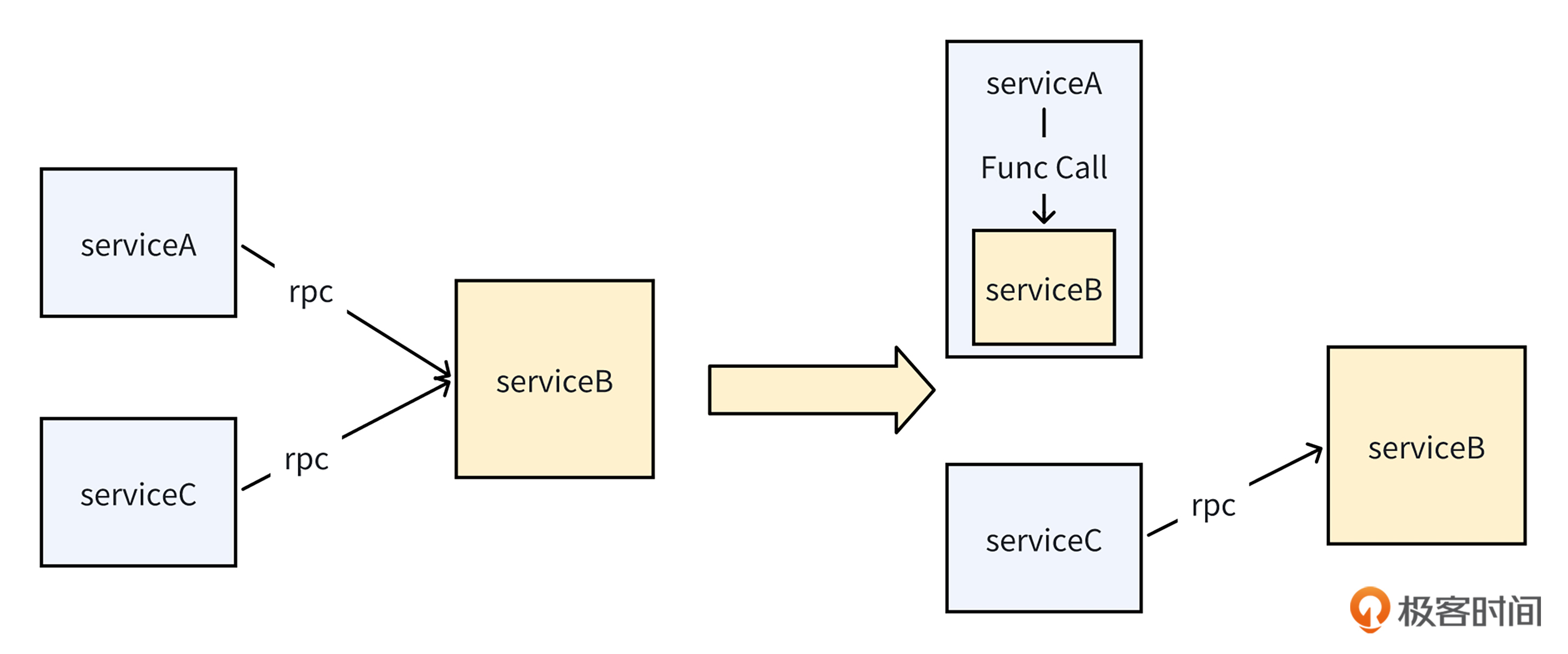 除了依赖冲突问题,我们需要应对的第二个挑战是,如何将Client对Server的RPC调用,替换成本地函数调用?