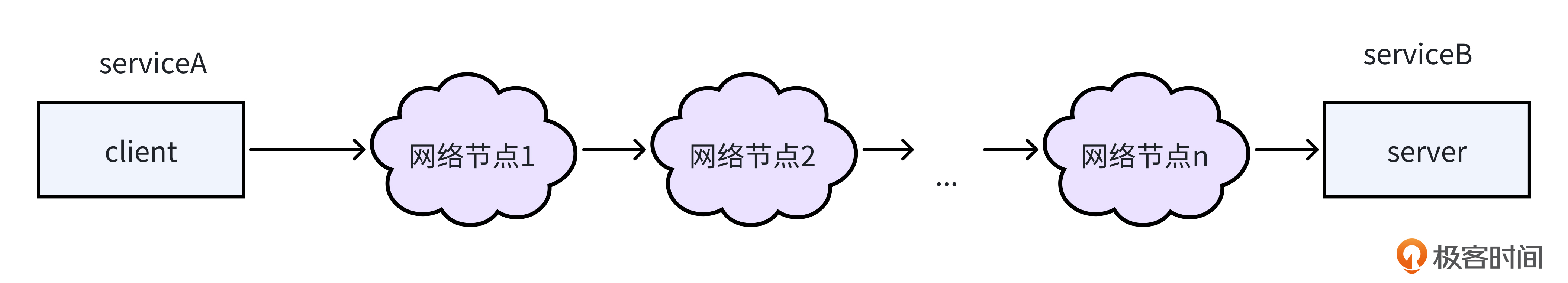 就像下面的图展示的一样,两个服务之间的请求调用会经过网络上的很多节点。服务之间的物理距离越远,经过的网络节点越多,两个服务之间的网络通信延时就会越高。