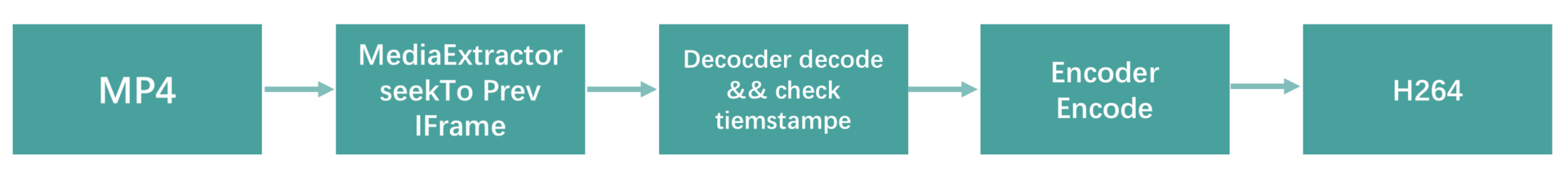 我们需要先seek到需要位置的前一I帧上,然后送入解码器,解码器解除一帧之后,判断当前帧的PTS是否在需要的时间戳范围内,如果是的话,再将数据送入编码器,重新编码再次得到H.264视轨数据,然后合成MP4文件。