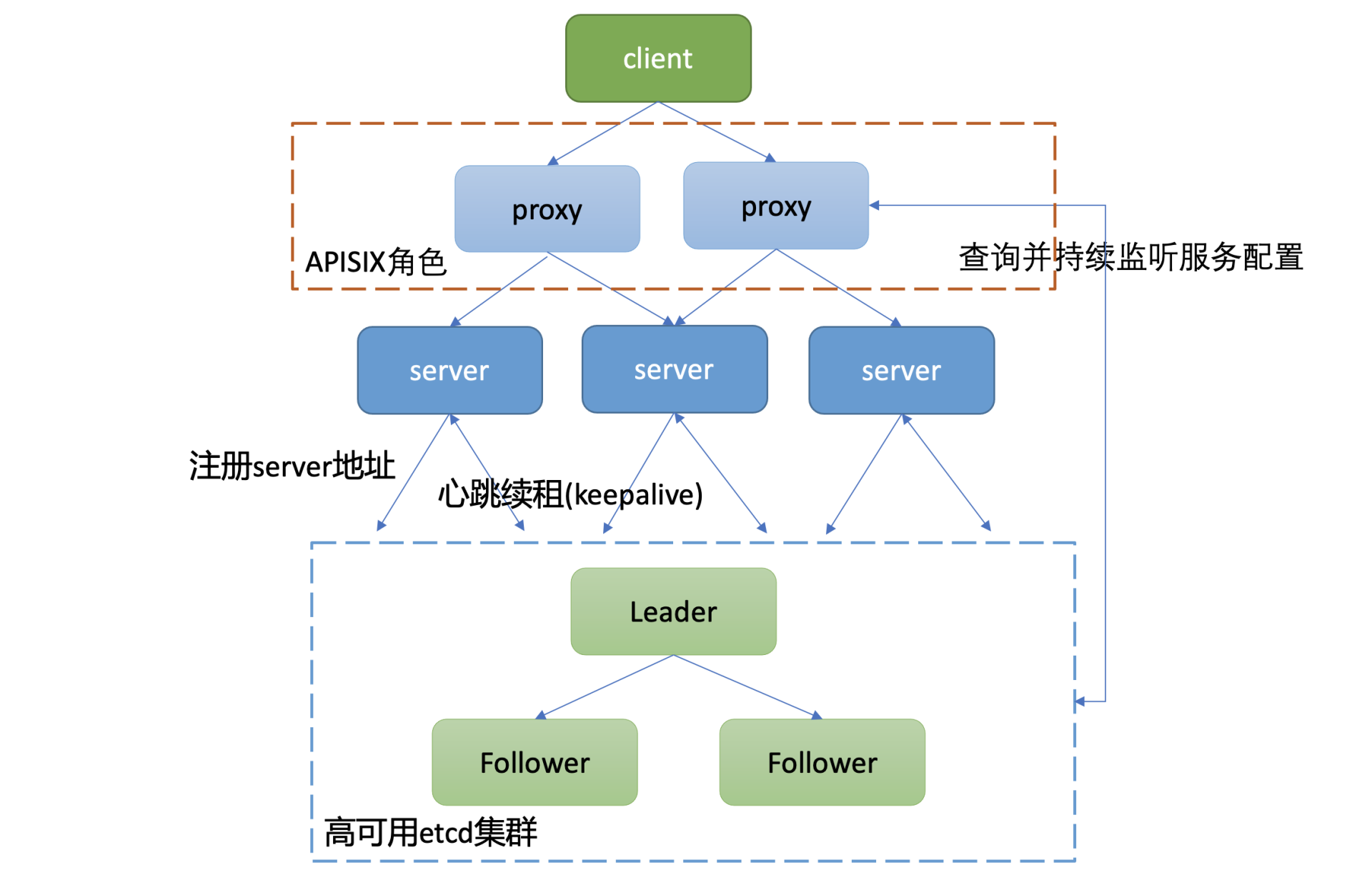 Apache APISIX其实就是上面服务发现原理架构图中的proxy组件,如下图红色虚线框所示。