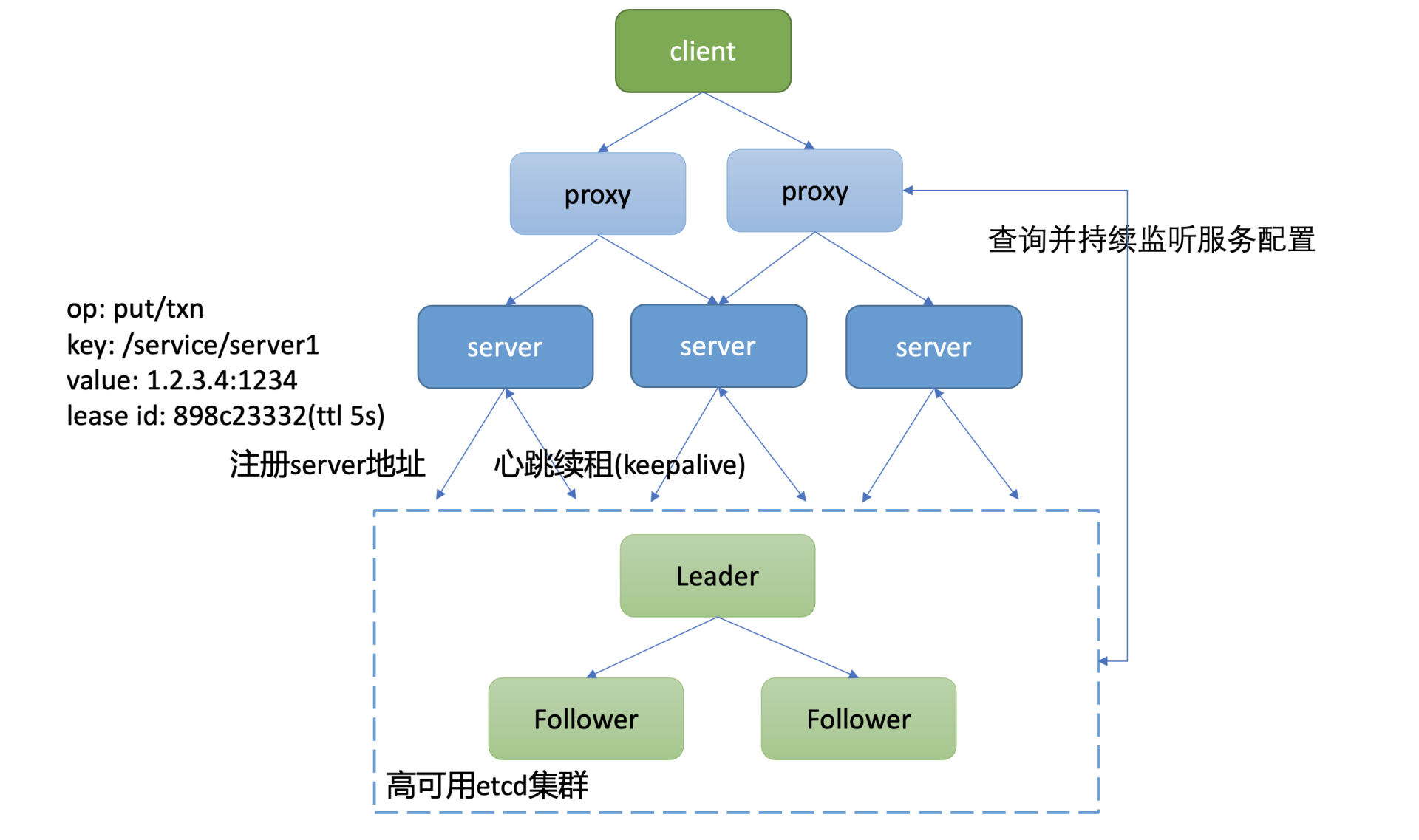- 业务server启动的时候,通过etcd的写接口Txn/Put等,注册自身地址信息、协议到高可用的etcd集群上。业务server缩容、故障时,对应的key应能自动从etcd集群删除,因此相关key需要关联lease信息,设置一个合理的TTL,并定时发送keepalive请求给Leader续租,以防止租约及key被淘汰。